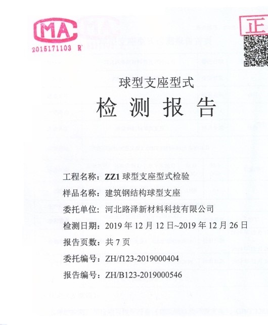 恭喜我公司顺利通过第三方检测单位出具的《建筑钢结构球型支座》型式检测报告,同时也是具备产品型式检报告的支座生产企业。此报告依据GB/T32836-2016《建筑钢结构球型支座》国家标准出具,是专业针对于建筑钢结构行业。建筑钢结构球型支座 不同于桥梁球型支座,并且桥梁支座的型式检测报告不能用于建筑钢结构领域作为验收标准,因为两者在受力、制作及计算方法不同,而且执行的国家标准也不同。